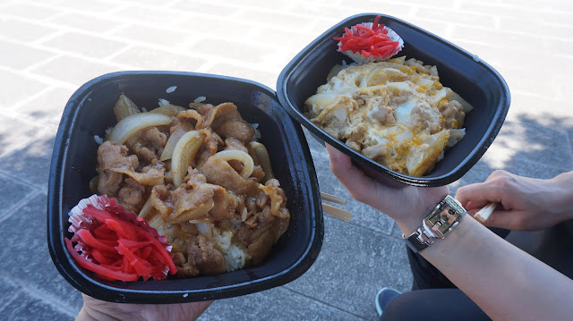由於觀光客太多餐廳都是客滿的,於是我們在路邊找到一家專賣便當的店,看起來很好吃就去買了。裡面的內容很豐富有豬肉炒洋蔥和親子丼。有時候不一定要大餐才叫午餐,我們比較喜歡吃當地人的午餐,感受一下那種感覺。附近有個公園, 找了一棵大樹坐下開始享受我們的午餐了。