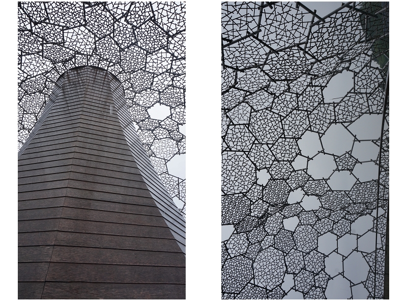 這是由藝術家設計的,原意是體驗四季的自然變化,冬天的時候上面的網狀會結滿冰,看起來會更晶瑩剔透。現在是夏天看不到可是可以想見冬天雪景一定很美。