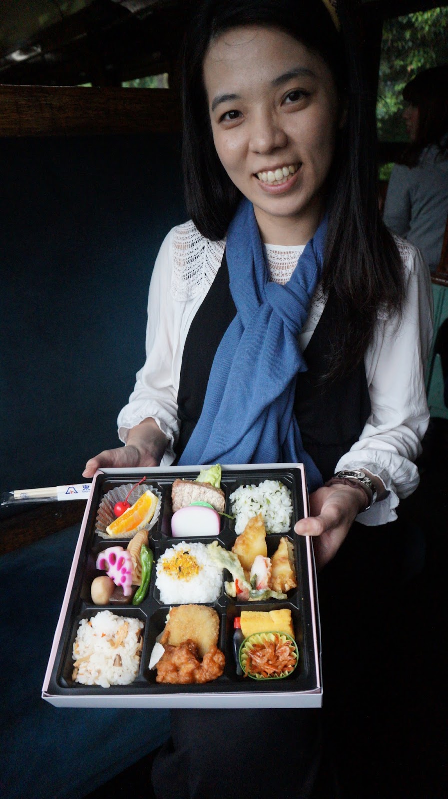 接下來就是重頭戲了,在火車上吃便當,這是一定要的,因為前一個車箱被旅行團包了,全車都在發便當,我們不吃的話實在太不應景了。