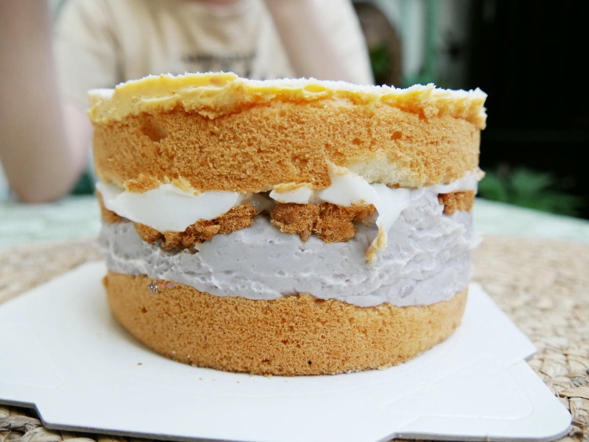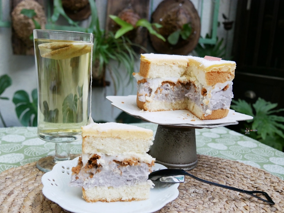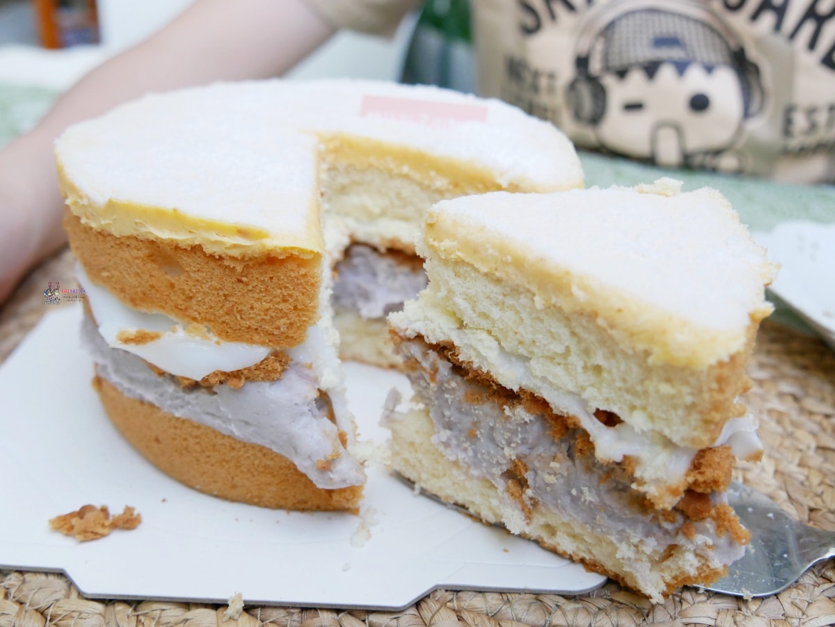 另外還有和芋泥超級搭的麻糬和肉鬆,讓內餡吃起來不會感覺很甜膩,整體味道就是甜甜鹹鹹的剛剛好,連Yelena這個很抗拒芋頭的小孩,隔天直接把蛋糕當早餐吃掉了一大半,可見這是一款連不愛芋頭的人都可以接受的芋泥蛋糕。