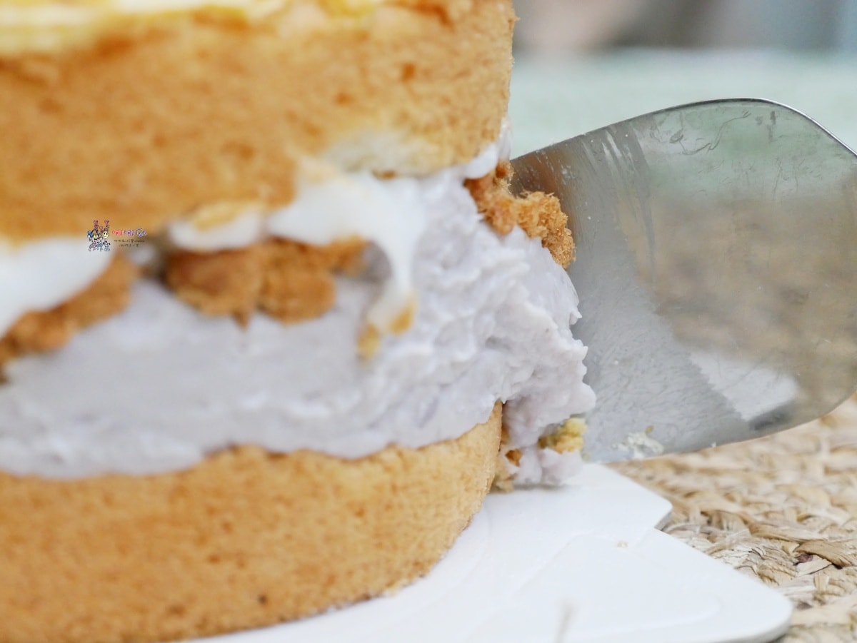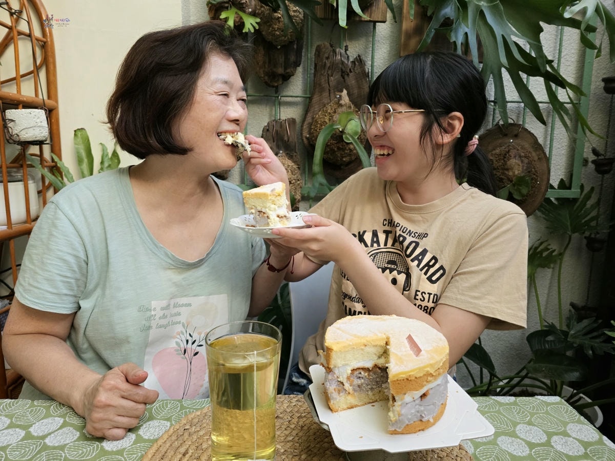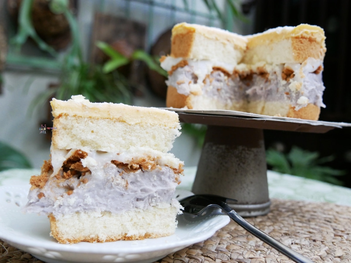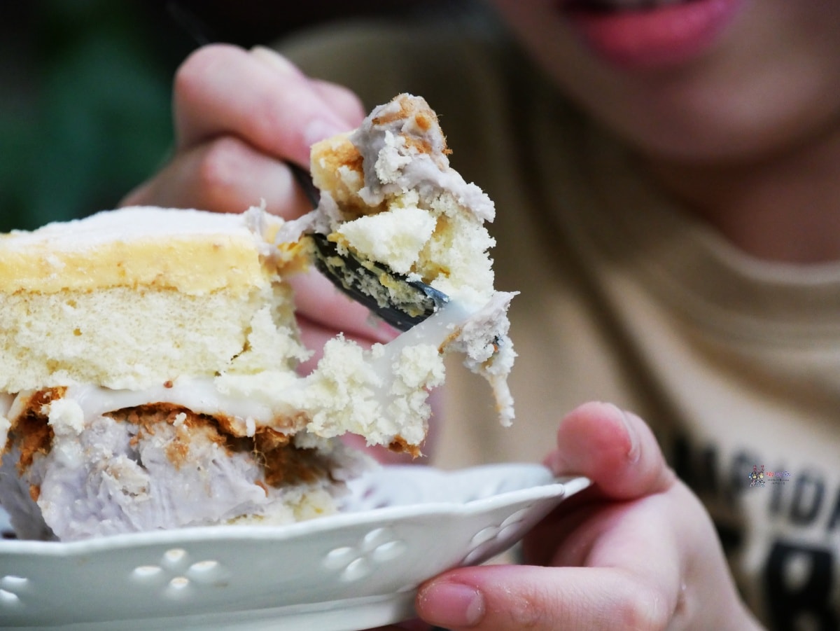 另外還有和芋泥超級搭的麻糬和肉鬆,讓內餡吃起來不會感覺很甜膩,整體味道就是甜甜鹹鹹的剛剛好,連Yelena這個很抗拒芋頭的小孩,隔天直接把蛋糕當早餐吃掉了一大半,可見這是一款連不愛芋頭的人都可以接受的芋泥蛋糕。