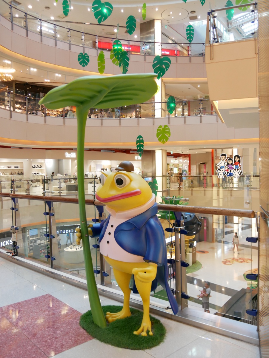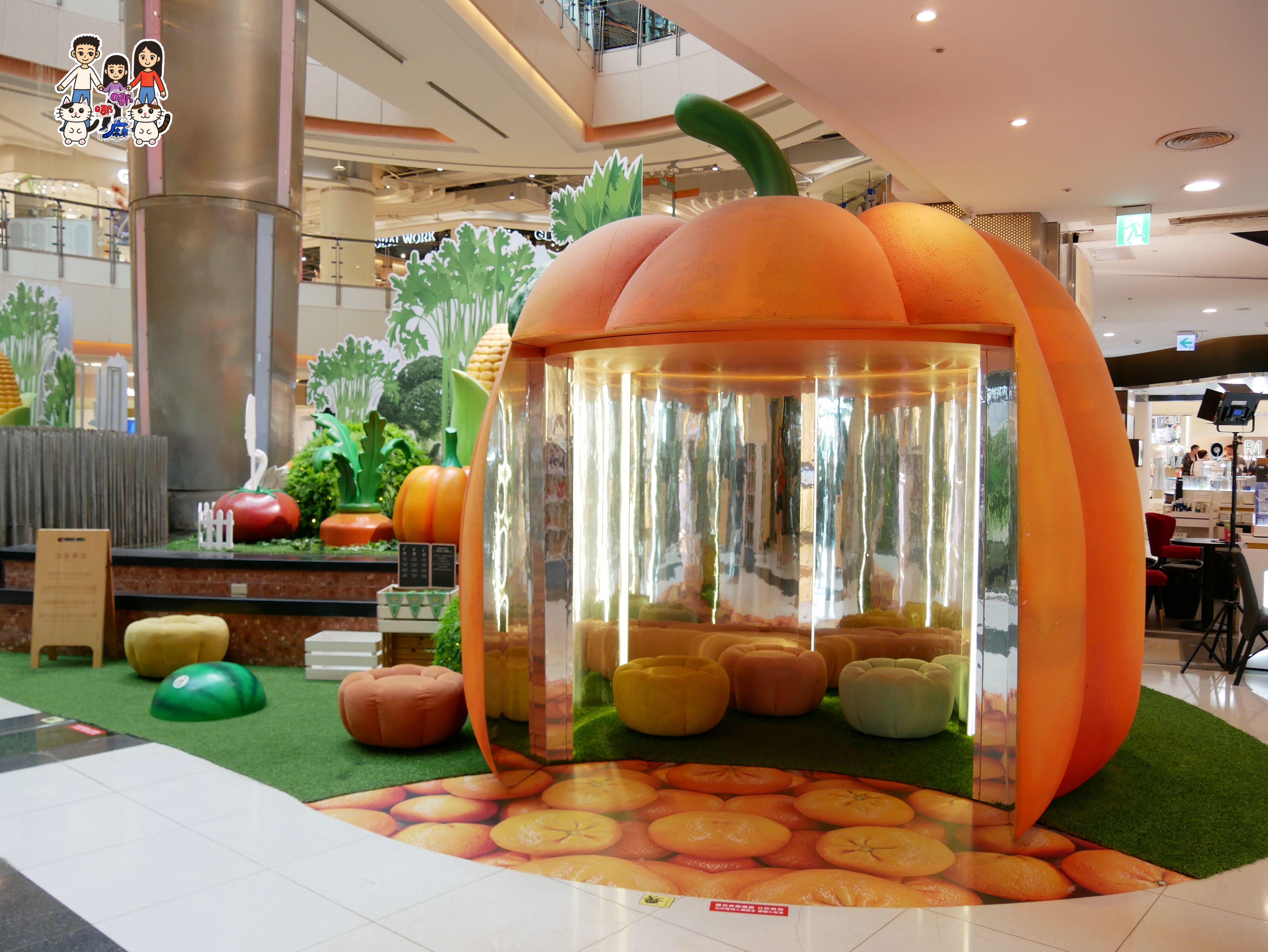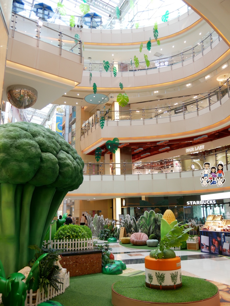 這次週年慶,大江特別在一樓中庭設置了「綠意仙境-蔬果之旅」的裝置藝術。走進去的瞬間,哪哪麻真的有種被巨大蔬果包圍的錯覺,像是番茄、胡蘿蔔、玉米都被放大好幾倍,瞬間變成 IG 打卡必拍場景。