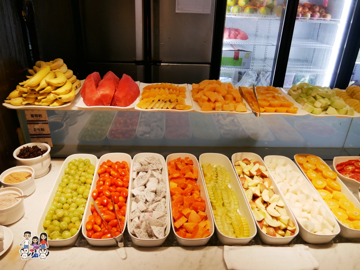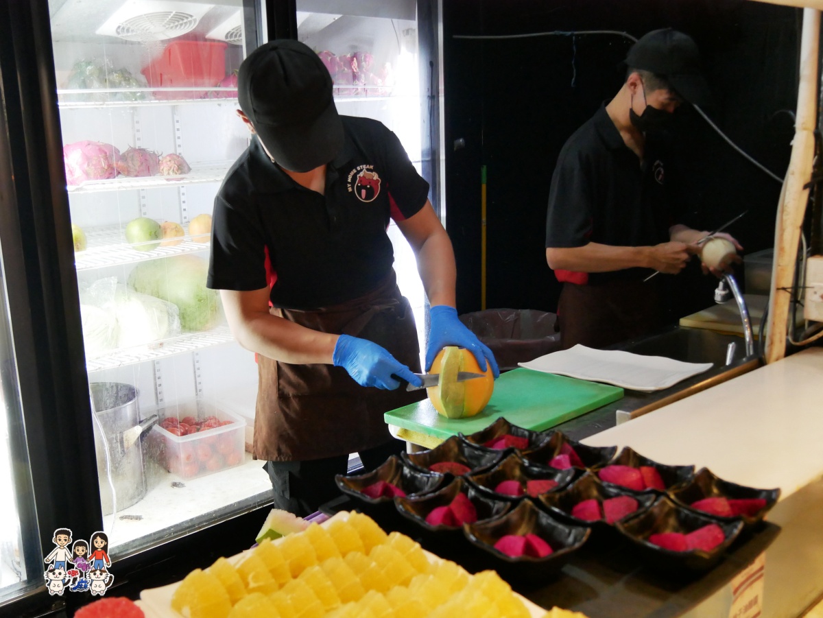 品項超多: 不只有基本款的西瓜、鳳梨,還有哈密瓜、葡萄、火龍果(紅肉的喔!)、木瓜、蘋果丁、小番茄等等,十幾種水果一字排開,讓你吃到過癮!