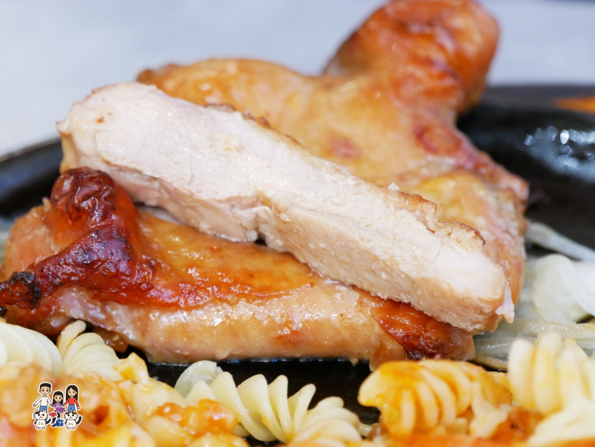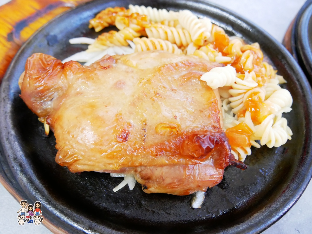 雞腿排的外皮煎得金黃酥脆,雞腿肉的部分很厚實,吃起來軟嫩多汁,完全不柴。配上鐵板上的義大利麵和醬汁一起吃,是讓人非常滿足的主餐,很適合不太吃牛或豬的朋友。